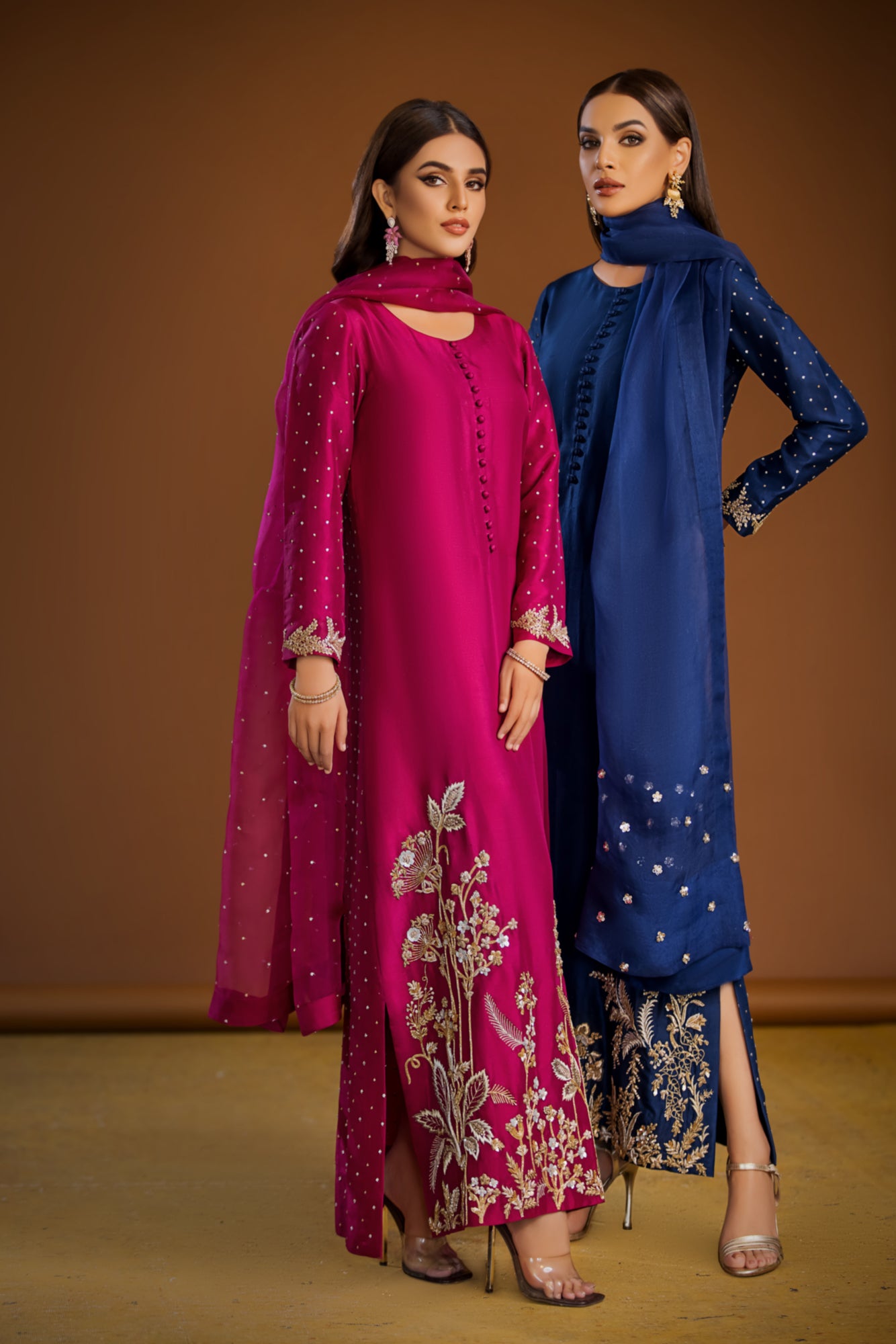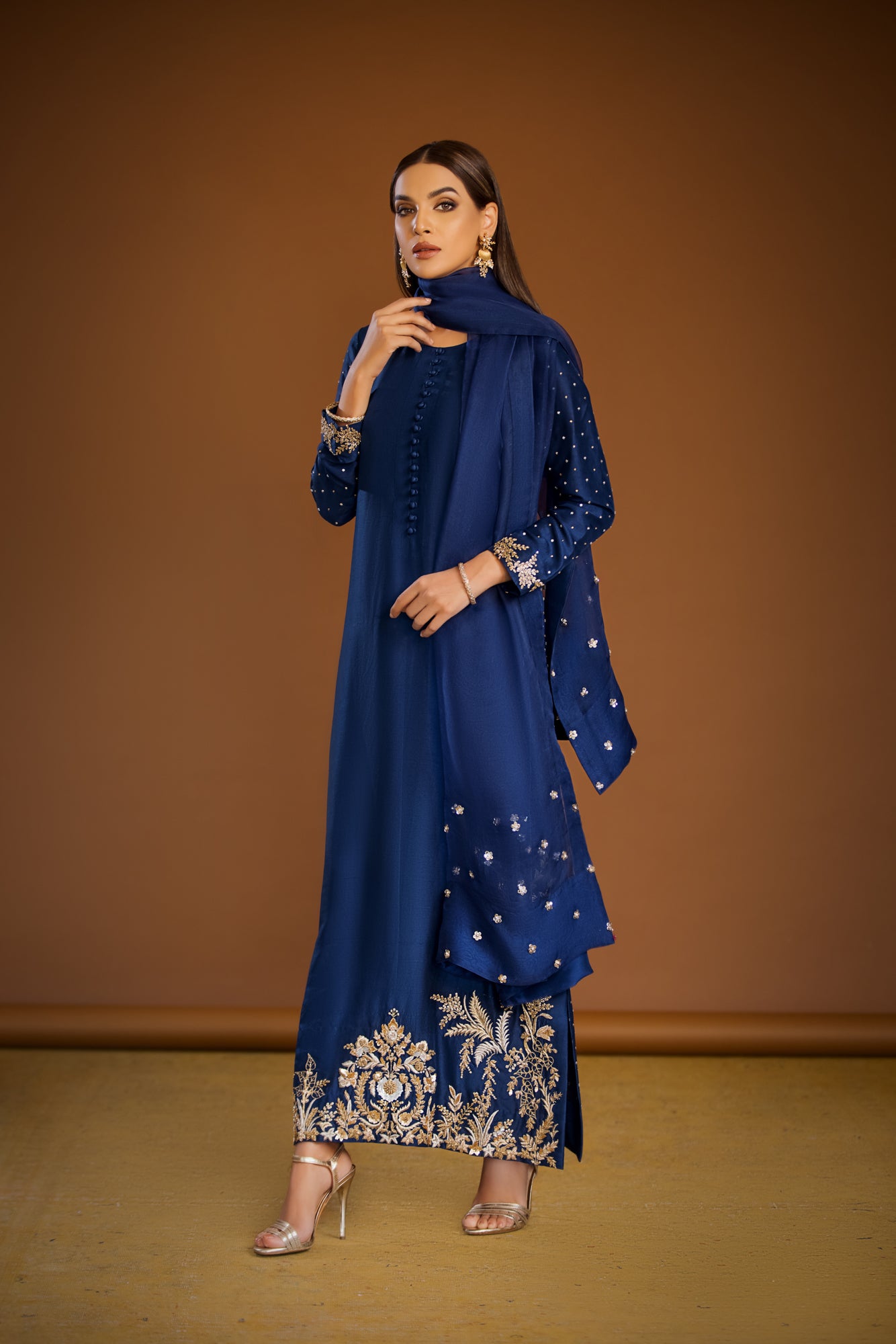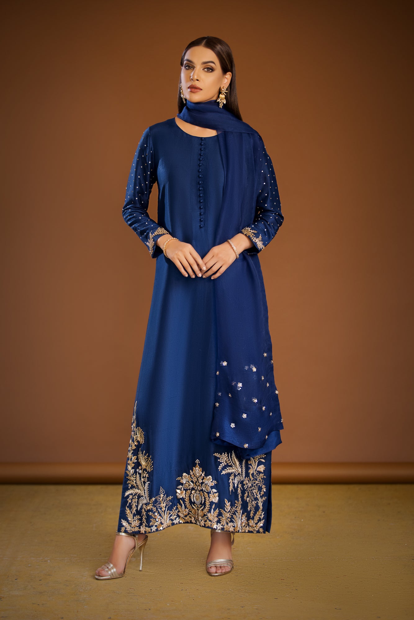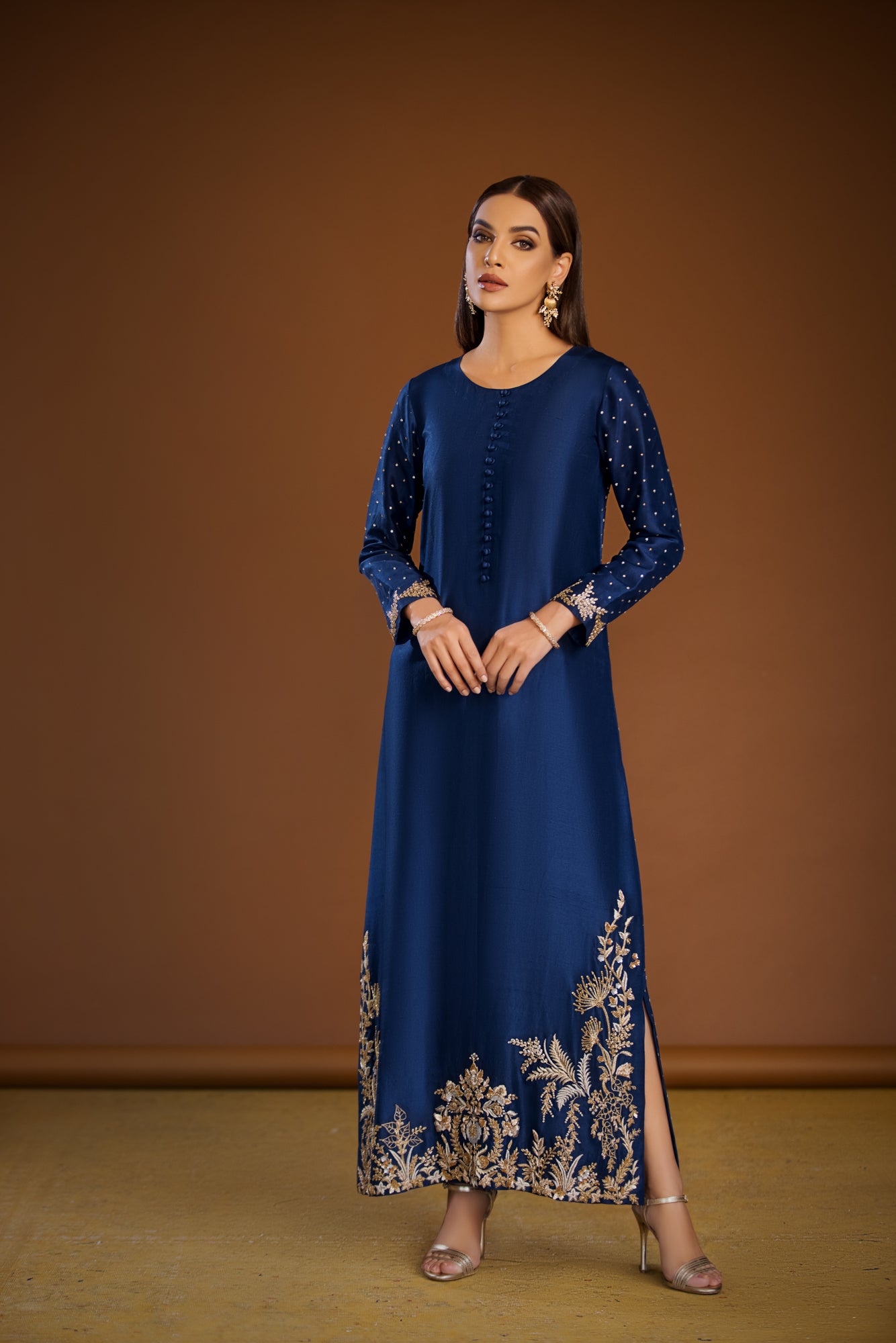 This blue maxi flows gracefully, outlining an eclectic silhouette and embellished with exquisite workmanship on its radiant canvas.