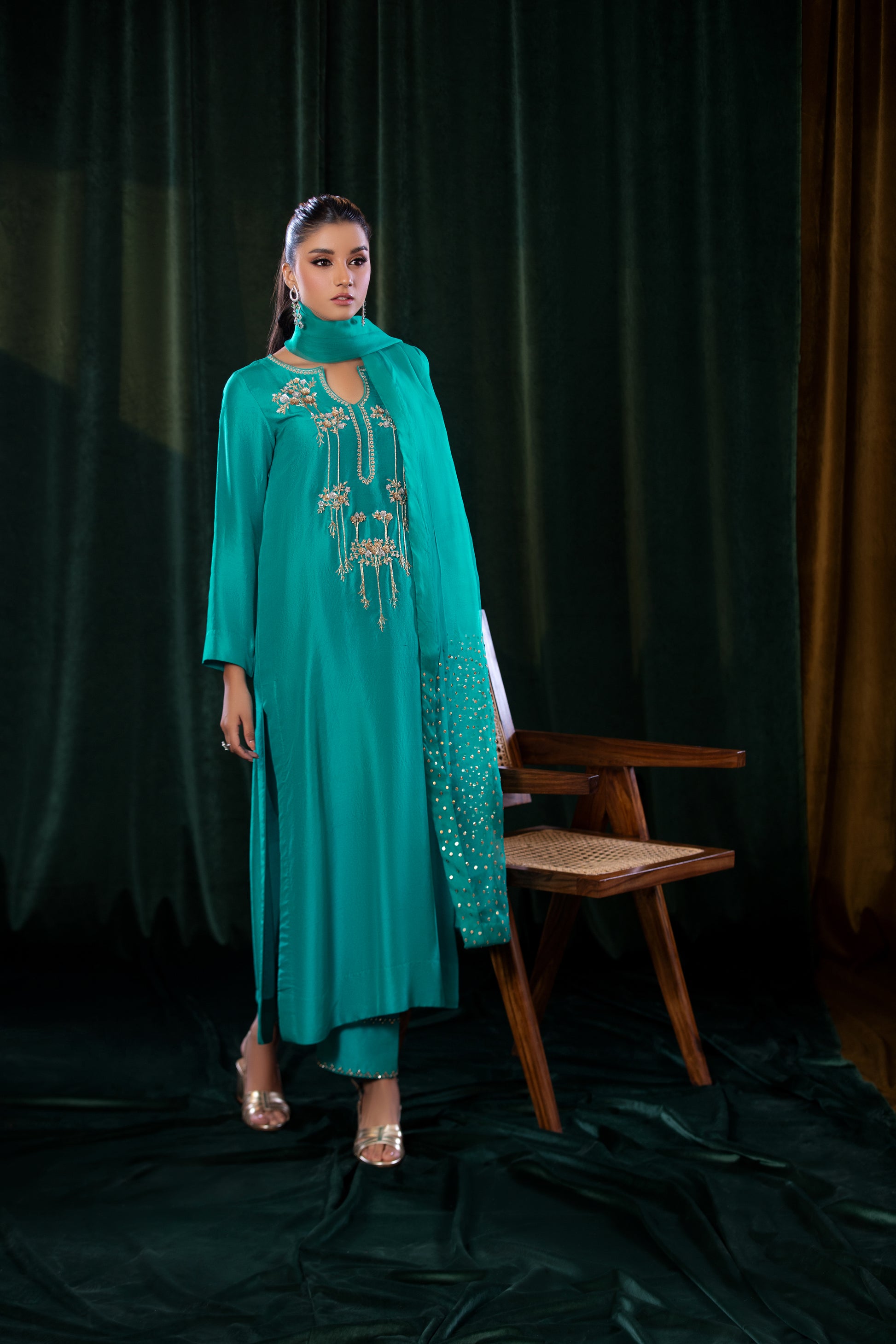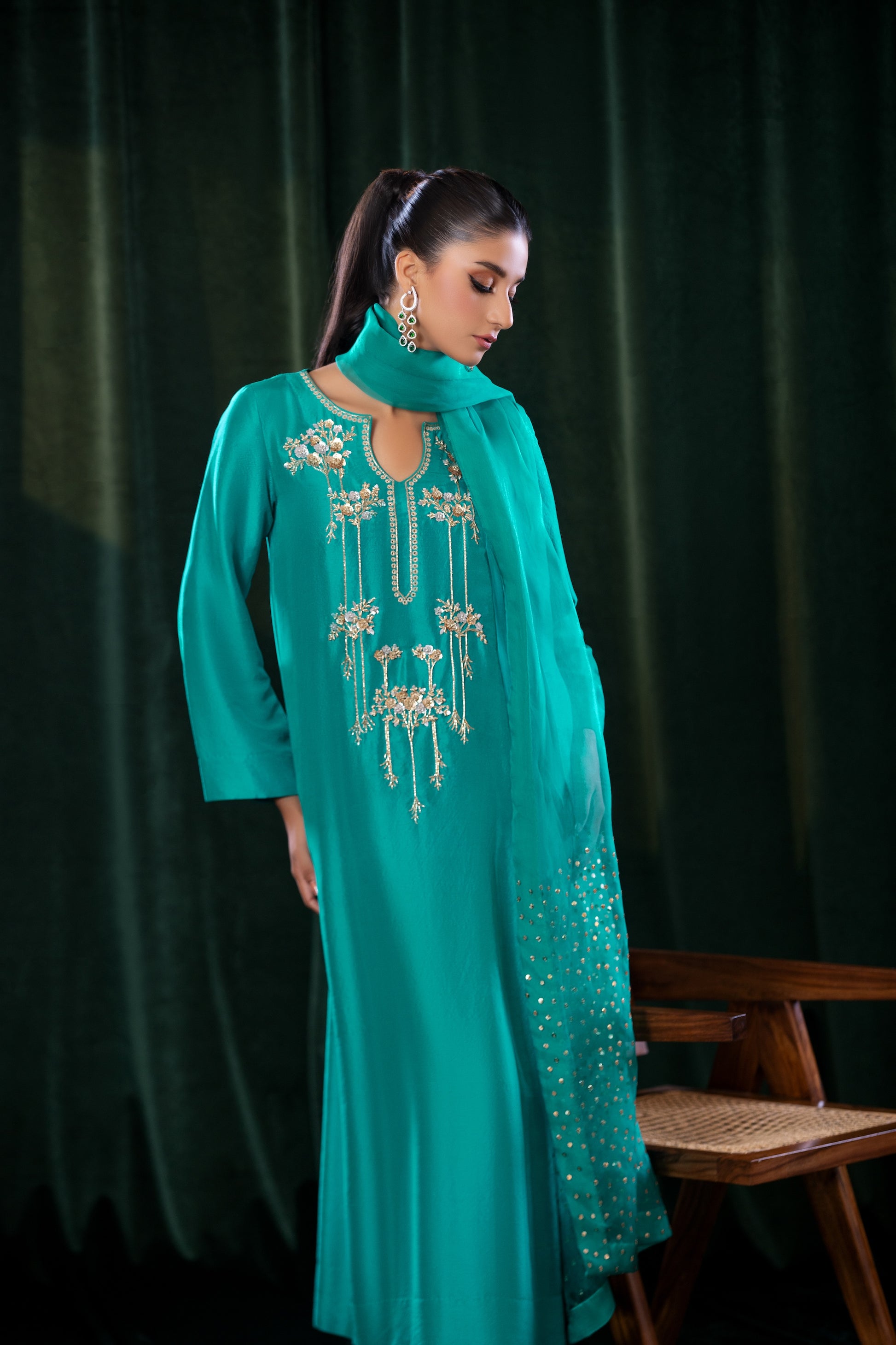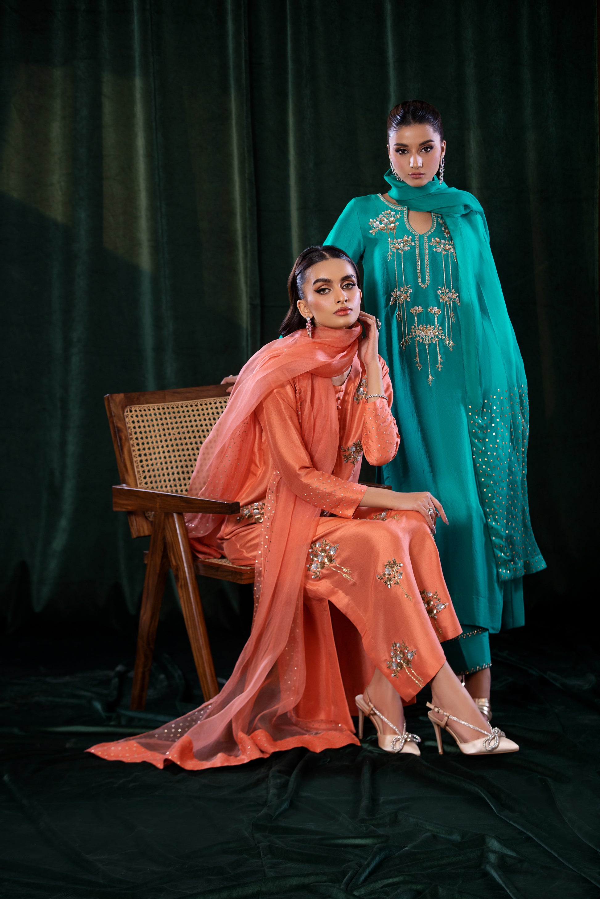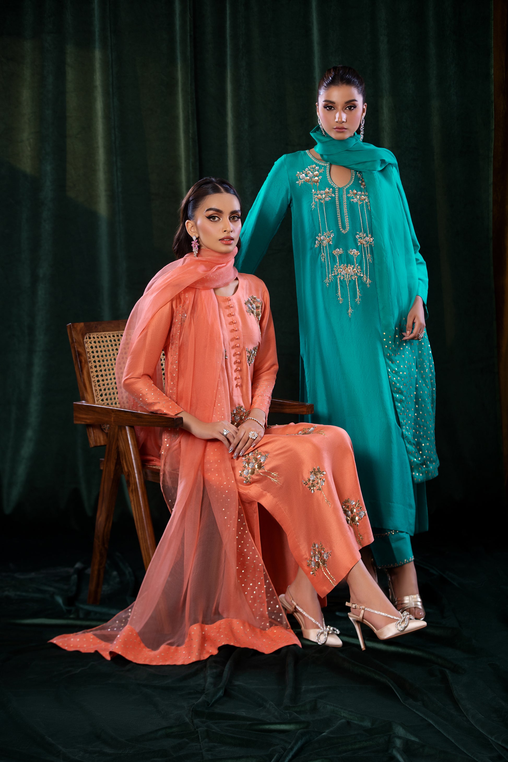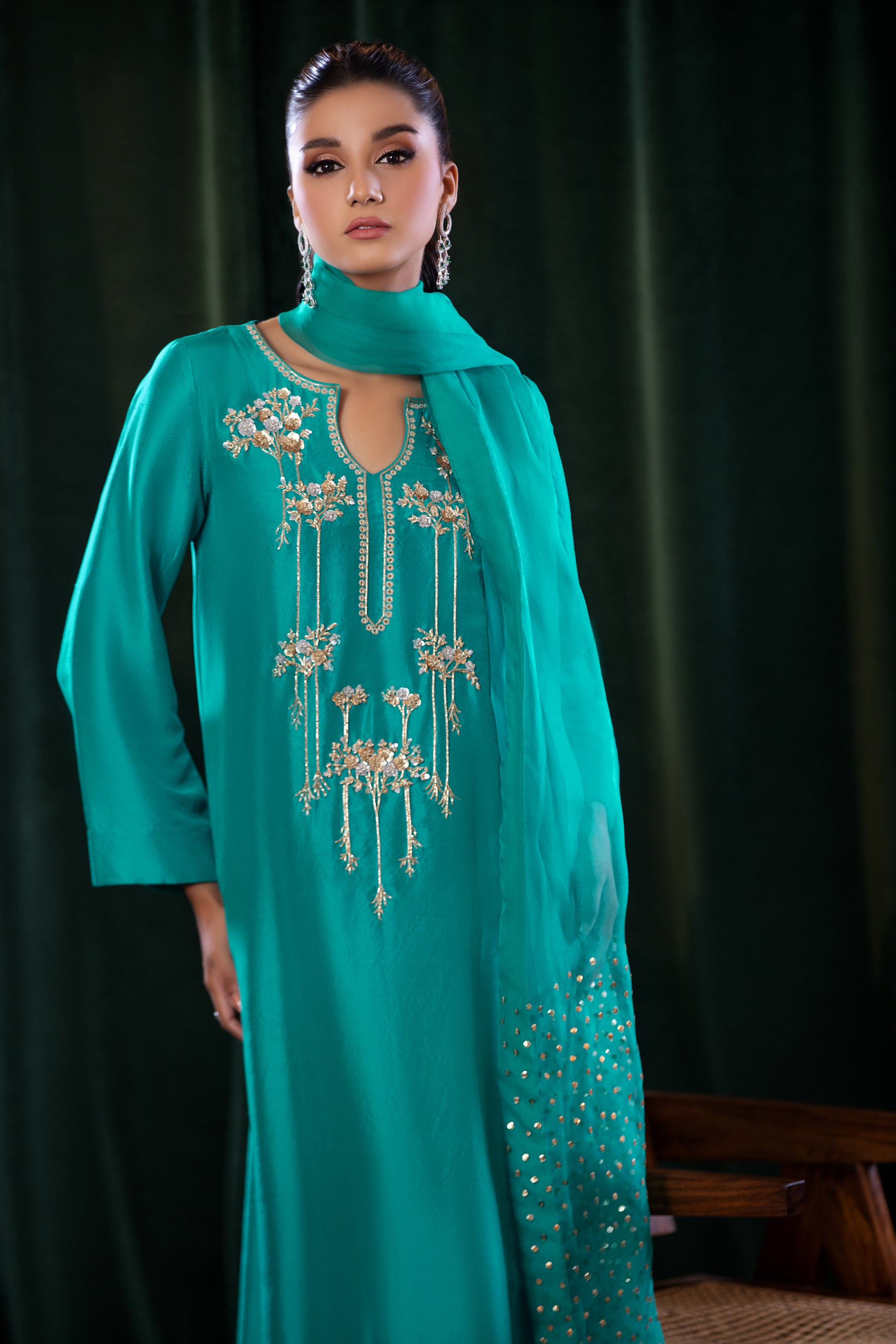 A cascading ensemble adorned with blooming flowers, handcrafted to perfection, weaving intricate beauty and timeless elegance into every stitch.